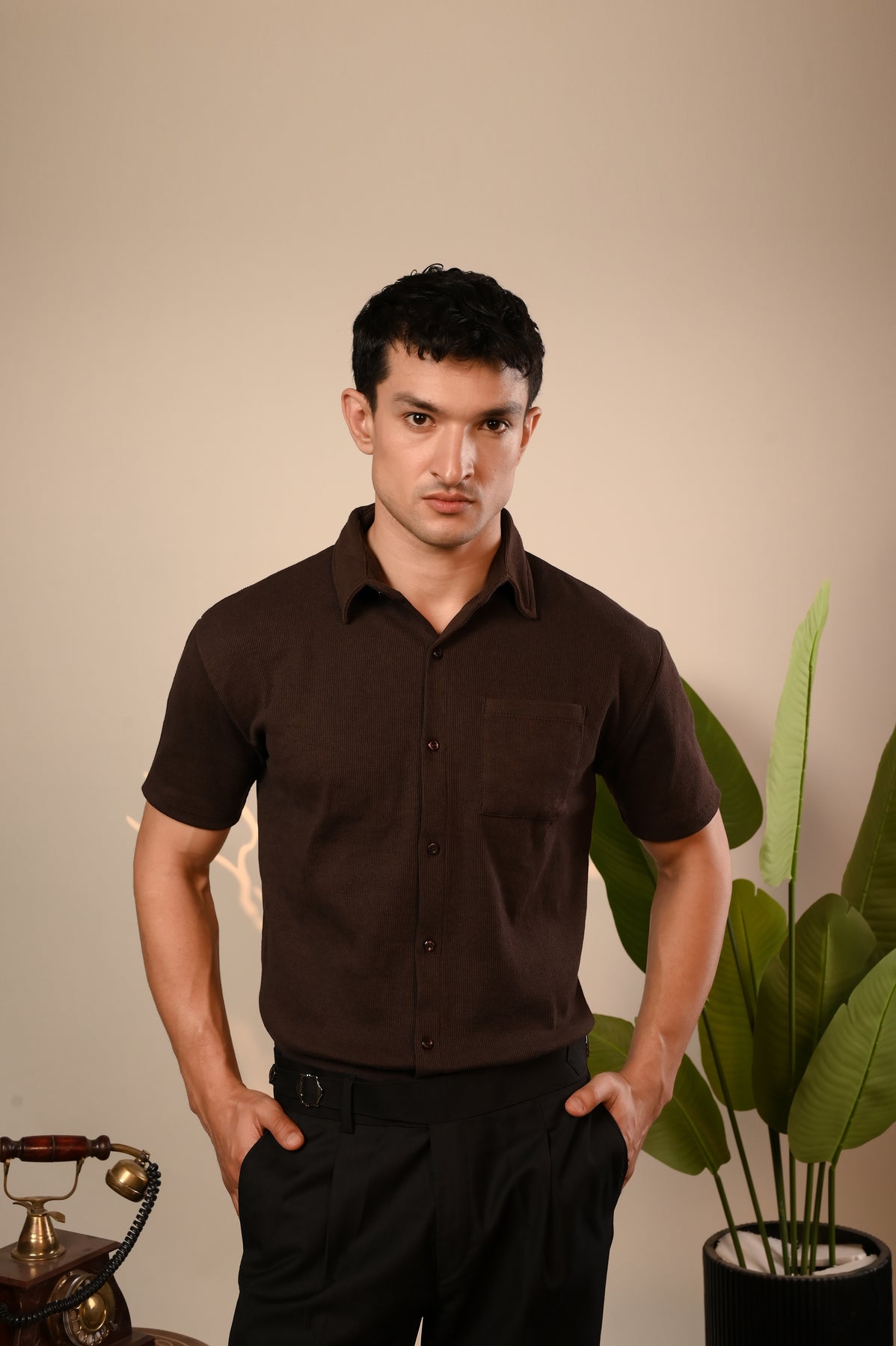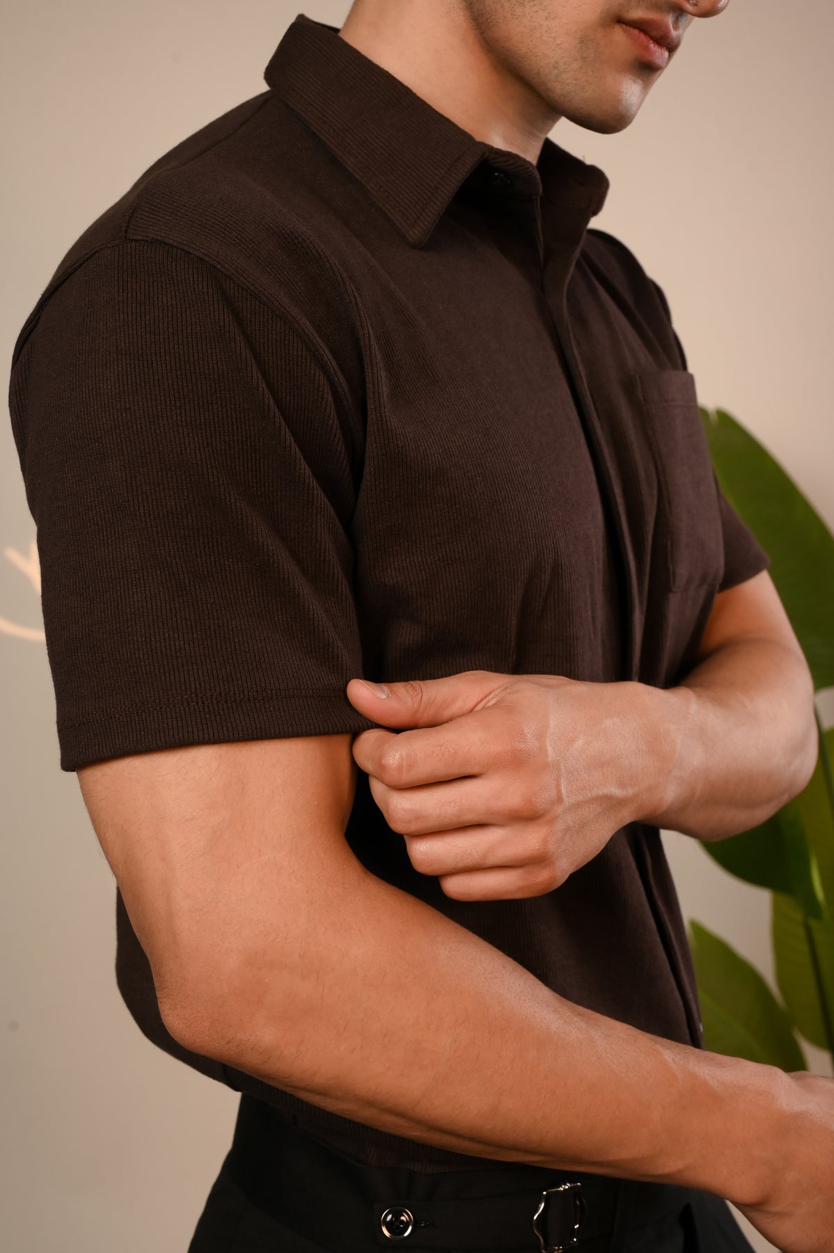 Understated. Comfortable. Timeless. The Ribbed Button-Down Shirt in Dark Brown brings together soft texture and effortless structure. Made from a ribbed knit fabric.